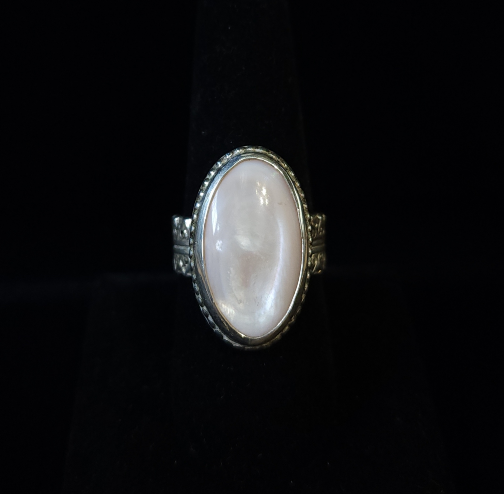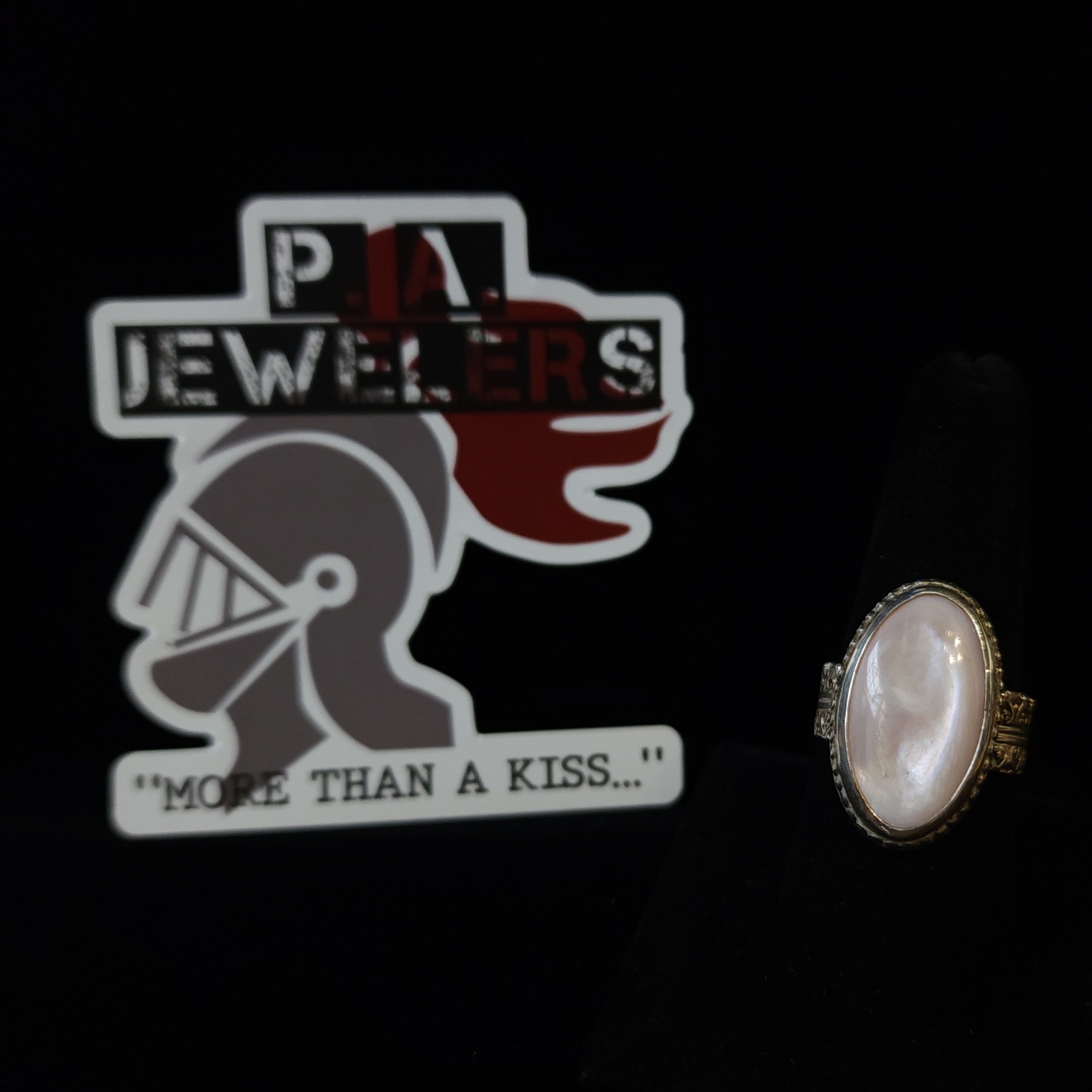 Mother of pearl is the shiny, thin layer of nacre coating the inner surface of the oyster in which the pearl forms. The name mother comes from the belief that the mother nacre shields and bears the pearl just the way a mother does to her child. This ring was designed & created by one of our local jewelry artists & is set in .999 fine & .925 sterling silver. The white mother of pearl in this ring is just gorgeous! So gorgeous that this ring almost became part of my personal collection…almost. So come and get it before I change my mind. 😂#morethanakiss #localjewelryartist #motherofpearl #motherofpearlring