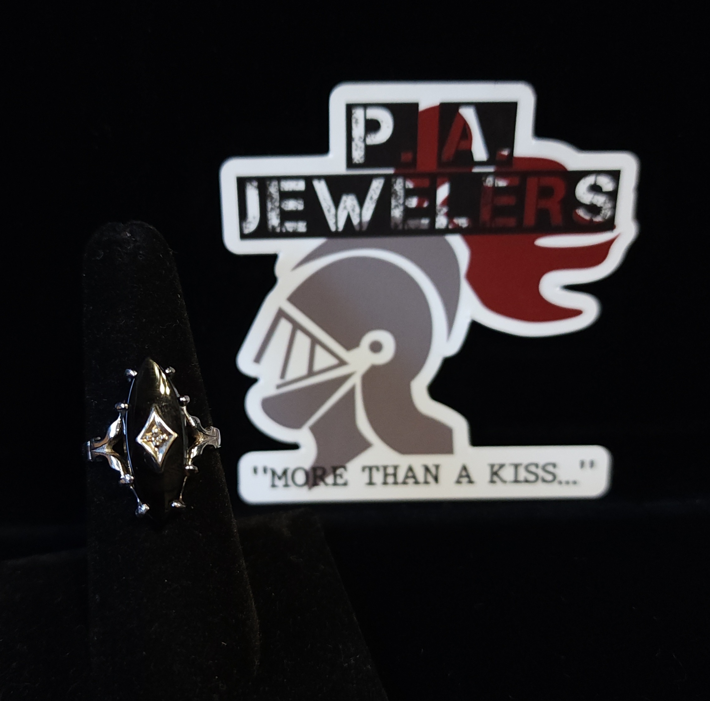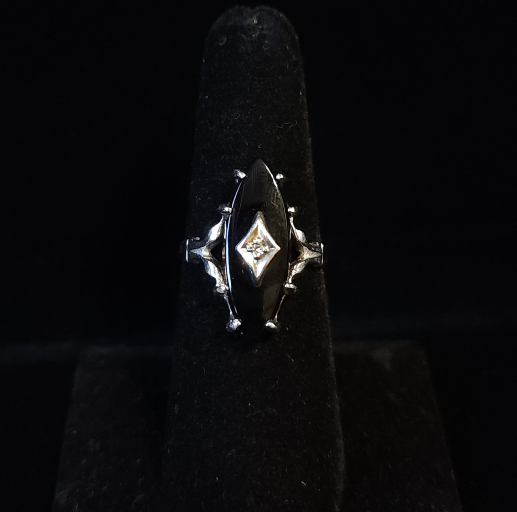 Of all of the antique onyx rings we have seen in the store, this one has been my favorite. The unique shape, the exaggerated prongs, the antique diamond…I love it all! Set in 10Kt white gold, this ring has a marquise shaped onyx with an antique diamond in a diamond shaped setting in the middle. #morethanakiss #antiqueonyxring #onyxanddiamondring