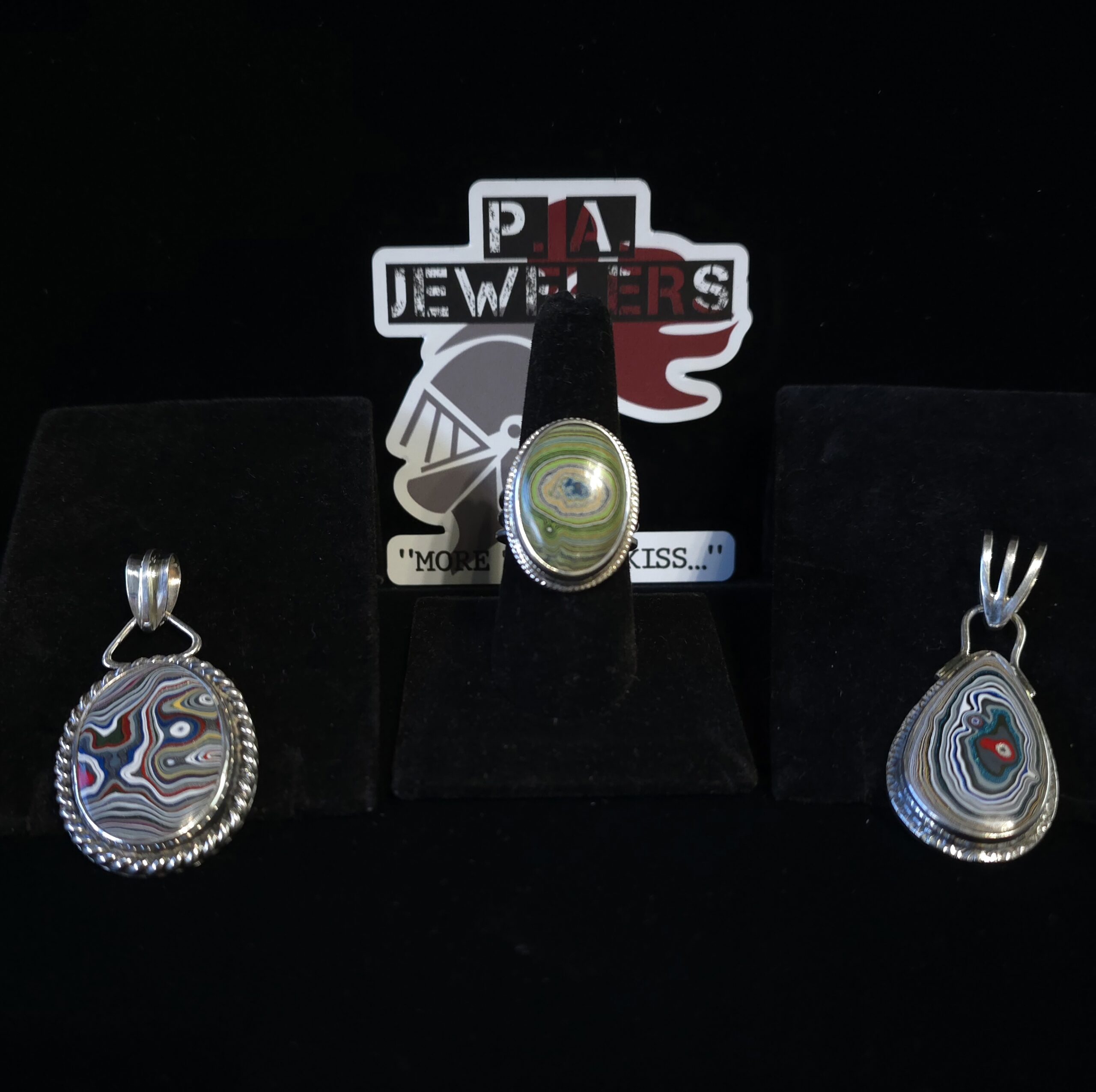 We are quickly becoming the place to go for unique, always one-of-a-kind Fordite jewelry! Today, we brought in 3 new pieces! The ring is primarily in shades of green, and the fordite is from a JEEP factory! The oval pendant has the most unique pattern I have ever seen and is from a Corvette factory! The pear-shaped pendant has a stunning layer of blue/green metallic paint and is from a MOPAR factory! #morethanakiss #fordite #forditering #forditependant #corvettefordite #jeepfordite #moparfordite