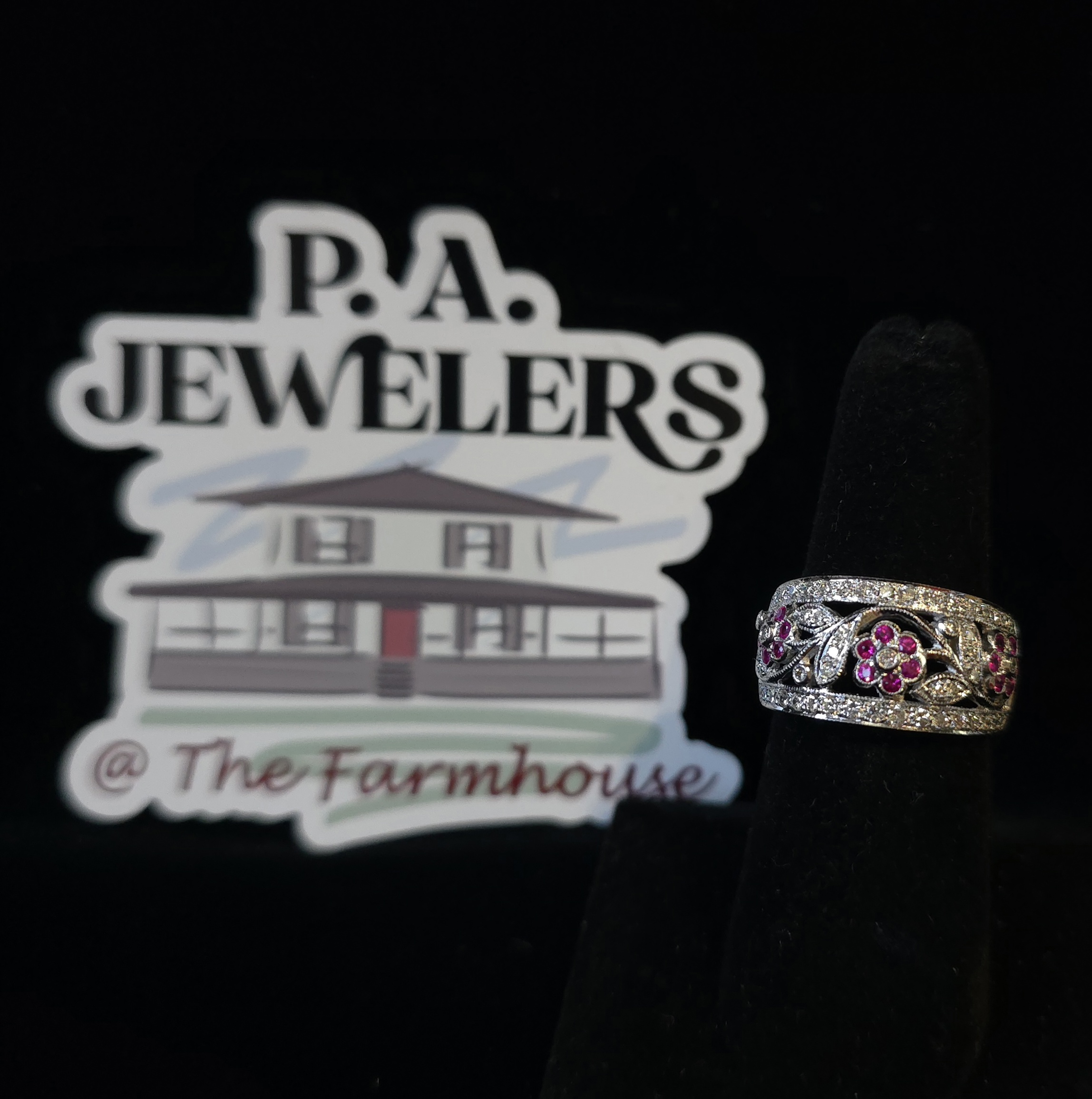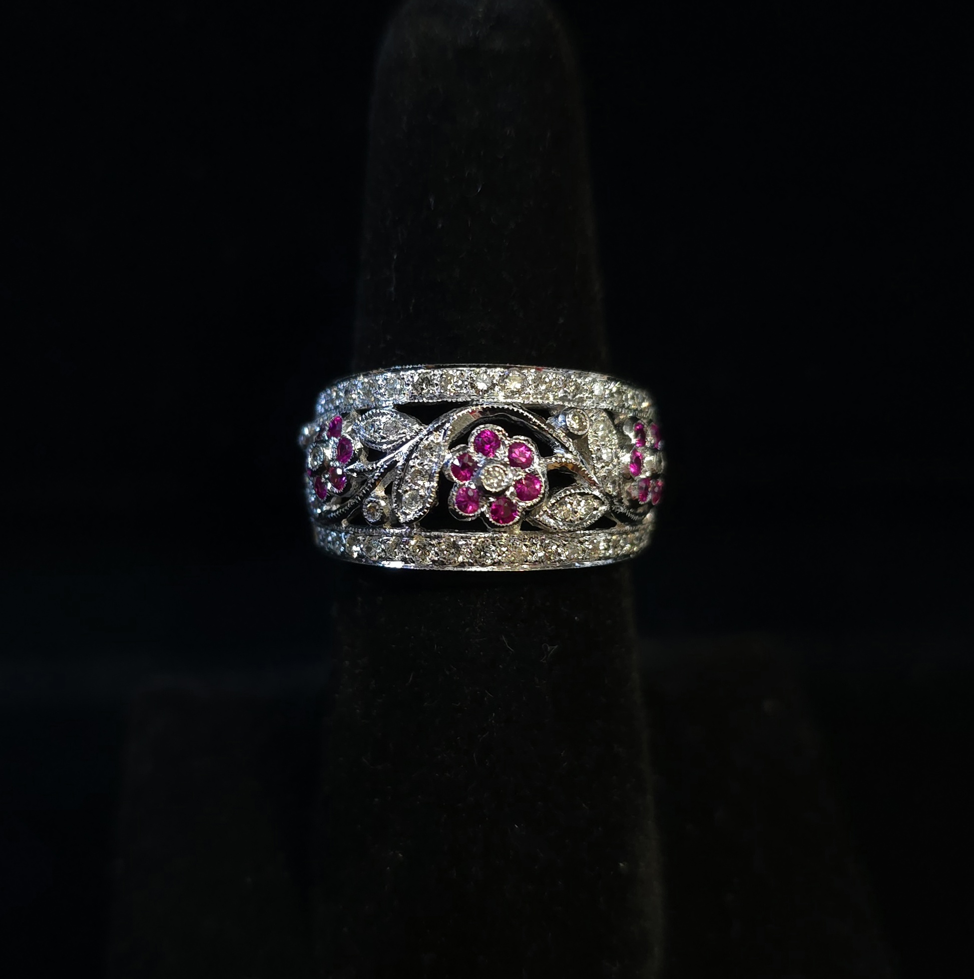 This band is an extraordinary 18Kt LeVian ring! It has .27Ct total weight of rubies, set as flowers 🌸 accented by .78Ct total weight of diamonds! This is one of the most beautiful LeVian rings I have seen ❤️! #morethanakiss #atthefarmhouse #estatejewelry #levian #LeVianRing