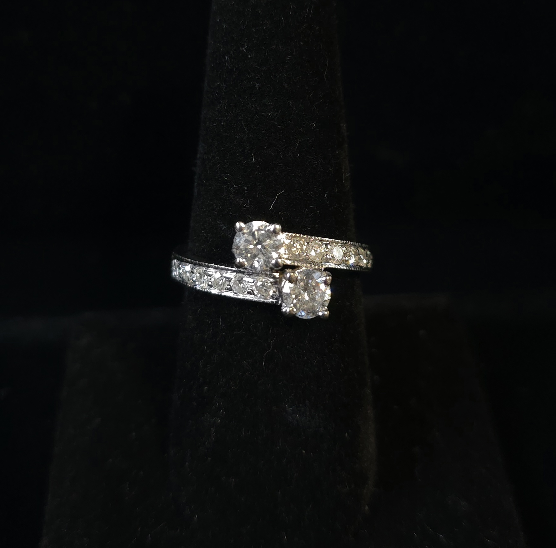 Set in 14Kt white gold, this gorgeous ring has 1.25Ct total weight of diamonds, set in a 2-stone bypass design with accent diamonds down the shank. This ring is so versatile! It could be a non-traditional engagement ring, anniversary ring, a just-because it is beautiful ring, or a you-deserve-it ring! š #morethanakiss #atthefarmhouse #estatejewelry #bypassdiamondring #diamondbypassring #twostonediamondring #2stonediamondring