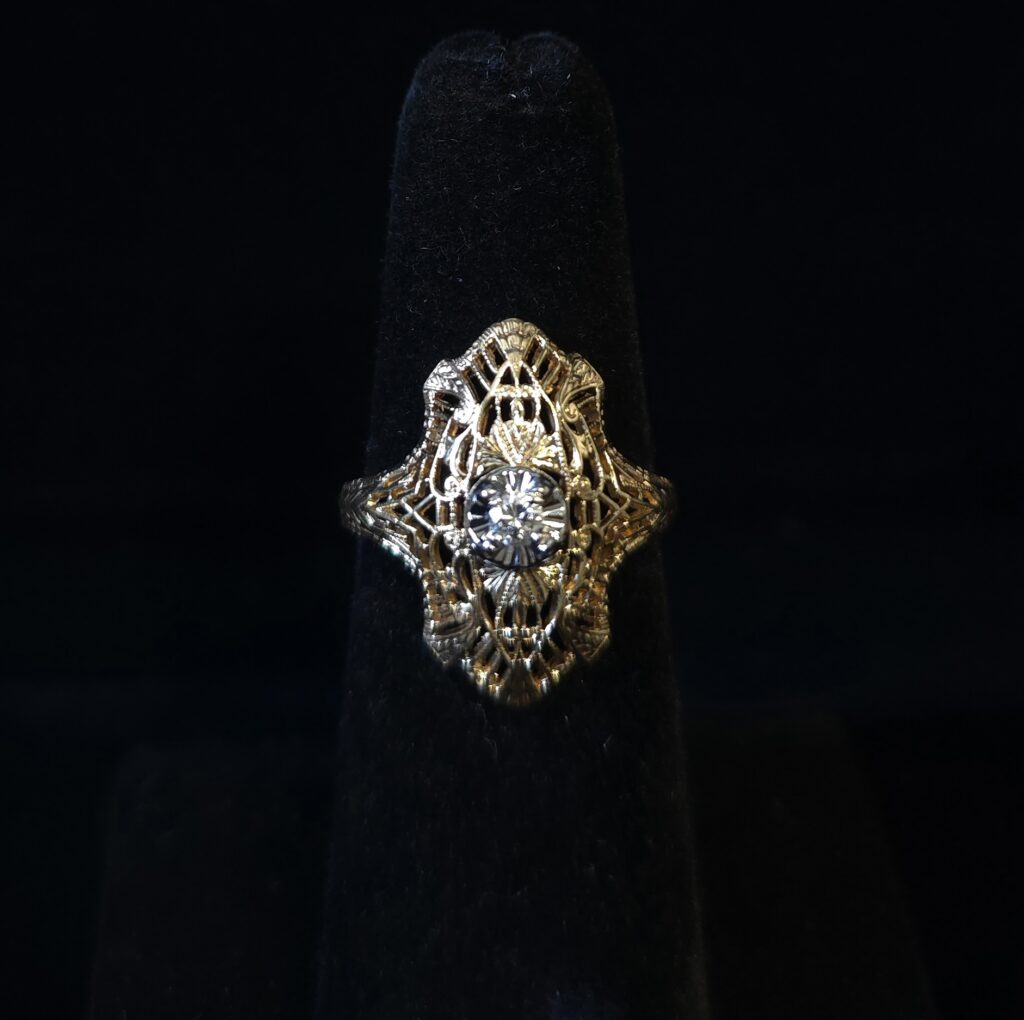The intricate design of filigree is a design style seen in many antique rings. And those rings are most often in white gold, so to find one in yellow gold is pretty unique. Set in 14Kt yellow gold, this antique shield-style filigree ring has a .08Ct diamond at its center. There is so much to love about this ring! #morethanakiss #atthefarmhouse #antiquejewelry #antiquefiligreering #yellowgoldfiligree