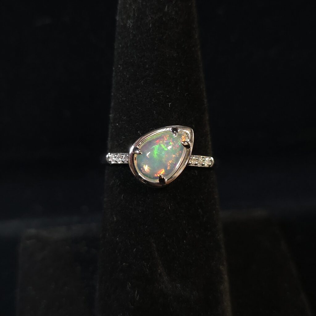 Two things drew me to this ring…the stunning fire in this natural opal and the unique pear-shaped cut of the opal! Set in 14Kt white gold, ths gorgeous ring has a .82Ct natural opal and .10Ct total weight of diamonds. #morethanakiss #atthefarmhouse #newjewelry #opals #opalring #opalanddiamondring