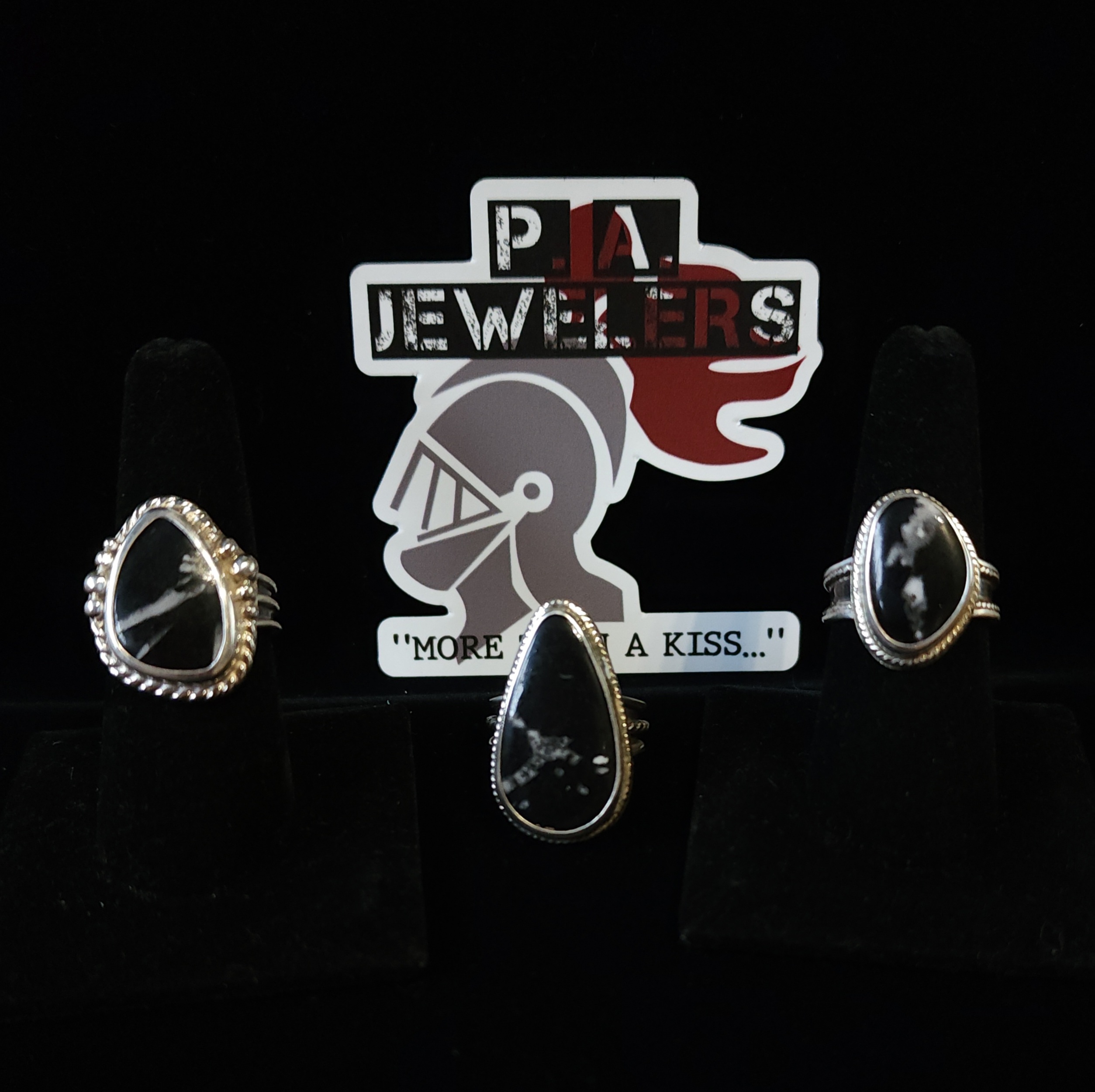 Set in .925 sterling & .999 fine silver, these rings all have almost completely black white buffalo turquoise! You typically find white buffalo turquoise mostly white with veins of black, so finding mostly black with veins of white is stunning! These three rings are...